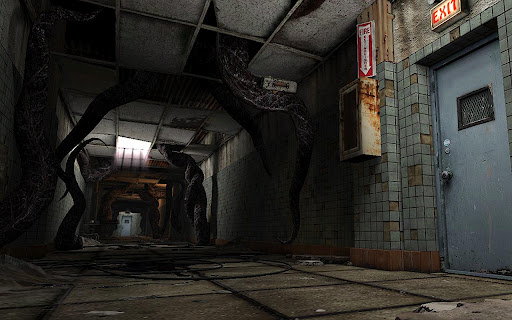 gestos, você explora as ruínas decadentes do Hospital Montclair, armado